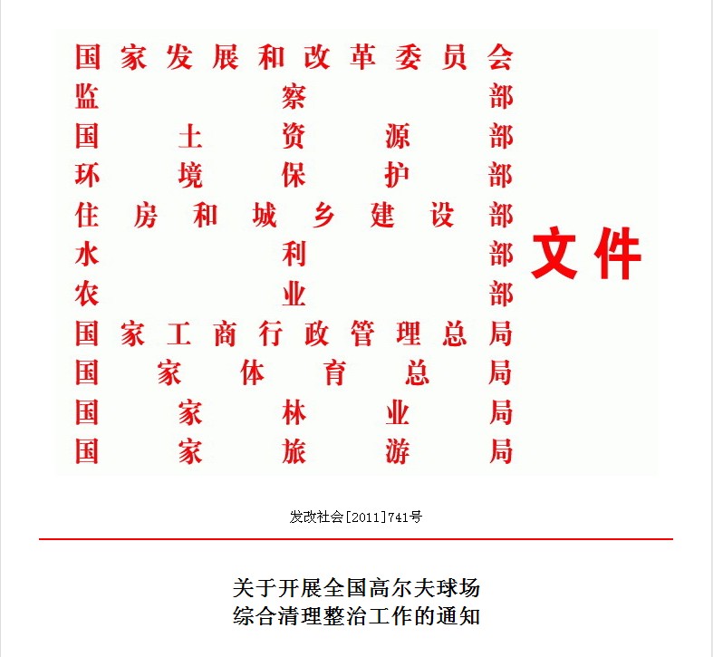 为合理利用和保护土地资源,遏制高尔夫球场的盲目建设,2004年,国务院办公厅印发了《关于暂停新建高尔夫球场的通知》(国办发[2004]1号,以下简称《通知》),明确要求暂停新建高尔夫球场,清理已建、在建的高尔夫球场项目。《通知》印发后,盲目建设高尔夫球场的现象基本得到了遏制。但最近一个时期,一些地方无视《通知》和国务院有关文件要求,违规建设高尔夫球场,占用大量耕地和林地资源,造成了极坏的社会影响。为切实加强规范管理,保护耕地和林地资源,坚决制止违规建设高尔夫球场现象,经国务院同意,在全国开展高尔夫球场综合清理整治工作。现就工作安排和要求通知如下: