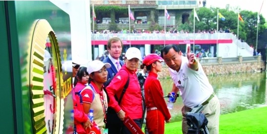 18 号洞果岭发生了有趣的一幕,一位连日来铁面无私维持秩序的外籍志愿者遭到“更有权力”的主办方官员的“驱逐”,两人用英语理论了近两分钟,志愿者对自己不 能站在那个区域表示不理解。
