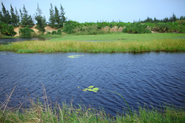 走进湿地公园,首先映入眼帘的是连绵数百里的绿色长城——木麻黄海防林带,这是一道壮观的风景线。公园地貌类型为平厚和海岸沙滩地貌,区域范围内没有较大河流,地面水主要有鸡沟田水沟,雨季可汇集周边数十平方公里的雨水,由于近海边,地下水极为丰富。进入木麻黄林带里,尽可以纳凉歇息、打牌、下棋,都会倍感轻松。在鸡沟田分布着十几株龙血树(又名南山不老松),其中有几株体型硕大,枝桠飘逸傲岸,比较罕见,令人敬畏,龙血树是植物的活化石,弥足珍贵。