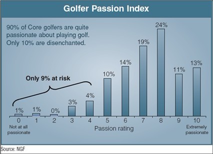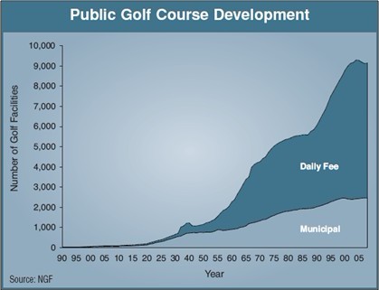 自1990年以来,高尔夫人口数量增加了16%,但是与此同时,高尔夫设施数量却增长了24%。其结果就导致了供需关系中的需求量的降低。打球轮次以每18洞球场计算的数量较当年同期下降了20%,也就是大约8000轮次/18洞球场。