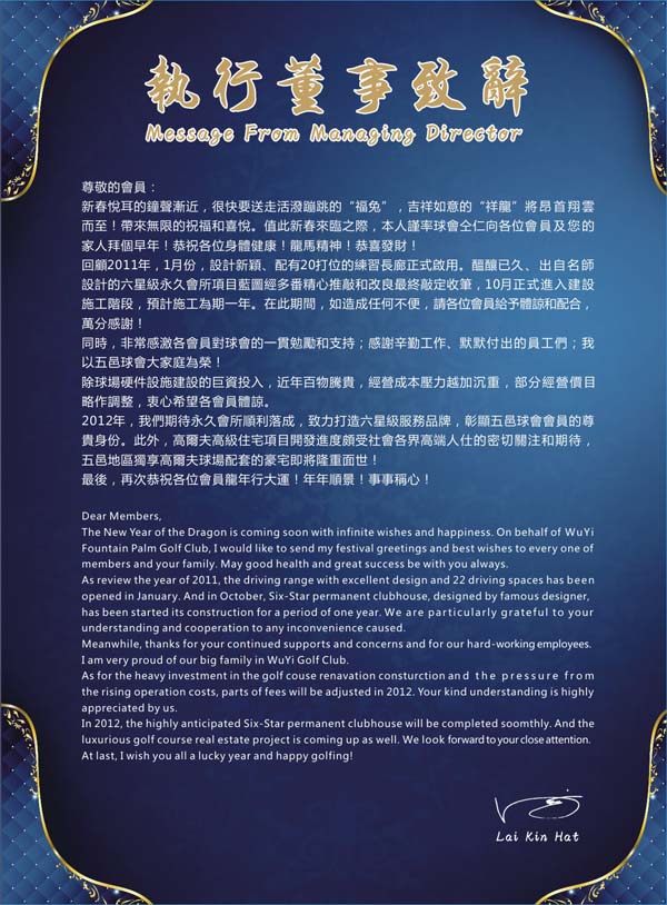 广东江门五邑蒲葵高尔夫球会执行董事新年致辞