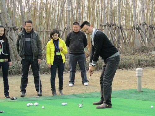 植树活动后,俱乐部还举行了高尔夫推杆比赛。并现场安排专业教练为高尔夫新手进行动作指导和示范,从抓杆、站位到组合动作,清晰讲解技巧动作和细节。比赛规定每人推五球,每球一杆。小小的球,五码的距离,却将高尔夫倡导的诚信、自律、毅力、智慧、策略、心理、心态控制的精髓体现得淋漓尽致。赛后为获胜者颁发了丰厚的奖品,最后所有人员合影留念。