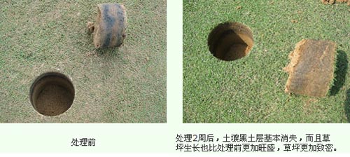 用生物方法对果岭土壤黑土层进行处理是很好的方法。可在不更换果岭草坪的情况下,重建草坪土壤好氧环境。使用土壤毒素处理剂ZAP(TM)能促使土壤微生物群落由厌氧平衡演替到好氧平衡状态,从而消除黑土层及其影响。实际使用效果证明,处理2周后,土壤黑土层基本消失,而且草坪生长也比处理前更加旺盛,草坪更加致密。