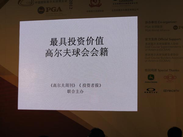 2012年3月16日下午,“最具投资价值高尔夫会籍评价活动”新闻发布会,在北京国家会展中心隆重举行。“最具投资价值高尔夫会籍评价活动”由《高尔夫周刊》与《投资者报》联合举办,旨在探索高尔夫会籍产品的价值和市场走向。