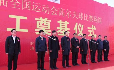 2012年4月5日上午10:00整,全国首个全运会高尔夫球比赛场馆改扩建工程奠基仪式在沈阳世纪高尔夫球场正式举行。出席今天开工奠基仪式的领导有:市委副书记、“十二运”沈阳赛区组委会第一副主任邢凯同志等市委及开发领导,同时莅临的领导分别致辞对于高尔夫球比赛场馆改扩建工程项目给予充分肯定,并希望该项目早日竣工,为第十二届全运会增添光彩,以专业精神升华一座城市的高尔夫文化。