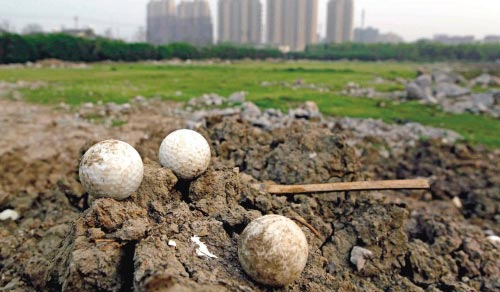 由于建筑垃圾随处堆放,且有许多外形不规则、有尖锐棱角的钢筋混凝土,所以在球场中行走颇为艰难。记者围绕着球场小心翼翼地走了一圈,发现周围都是大小工地,而在球场南侧的不远处,就是石臼漾水源湿地。在乱石和泥土中,记者发现了很多遗落下来的高尔夫球,记录着这里昔日的辉煌,见证着如今的破败和荒凉。