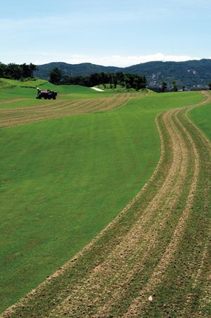 在高尔夫球场我们每年必须对草坪进行两到三次打孔,为什么要打孔?打孔的目的是为了疏松土壤把土壤中的有害气体排出,并把老根带走。促进草坪新根系的生长发达。打孔的另一个目的是让经过梳草、切草根之后的受“创伤”草坪的根系迅速向疏松富含水分的土壤中发育。这一养护过程的效果一般七天左右就可以看到。