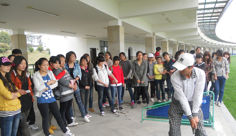 名流高尔夫球场的营运总监廖胜利首先欢迎大家的到来,并亲自接待。同学们乘坐观光车浏览了球场美丽的风景,并在球僮的讲解下,了解了高尔夫球场的构成及相关知识。同学们惊异于球场美丽的风光,并纷纷拍照留念。而后同学们来到高尔夫练习场上,由专业教练讲授了高尔夫技法。同学们纷纷拿起球杆,体验了一把挥杆的感觉。最后同学们参观了会所,工作人员仔细的讲解了会所的设施及球僮的工作流程。