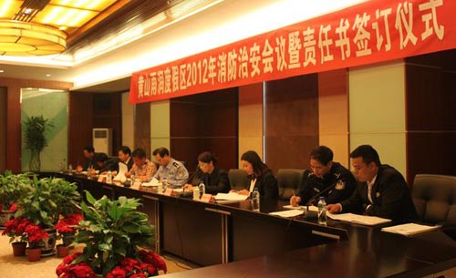 最后,各单位负责人在奕棋镇派出所的见证下共同签署了度假区2012年度消防治安责任书。