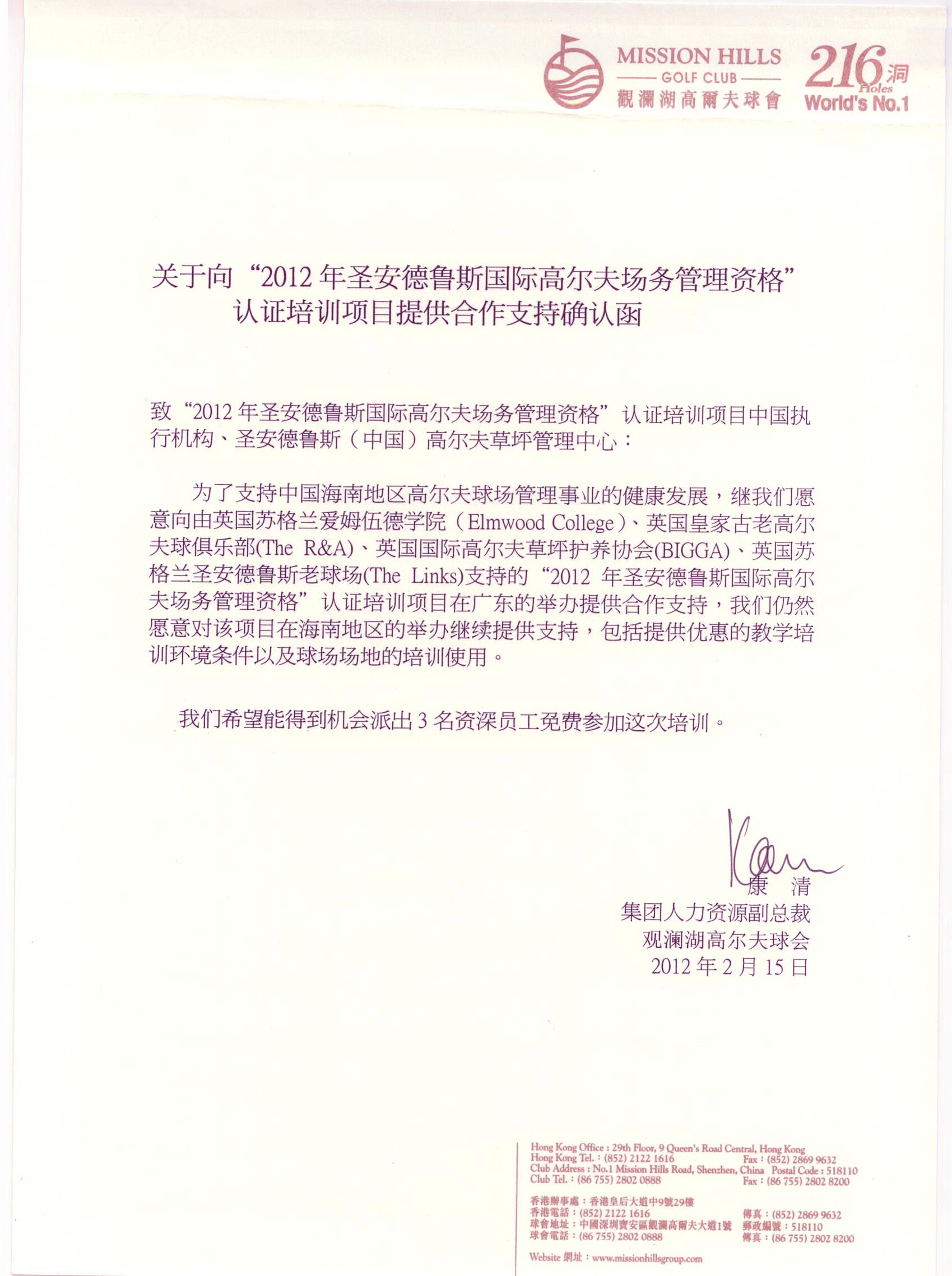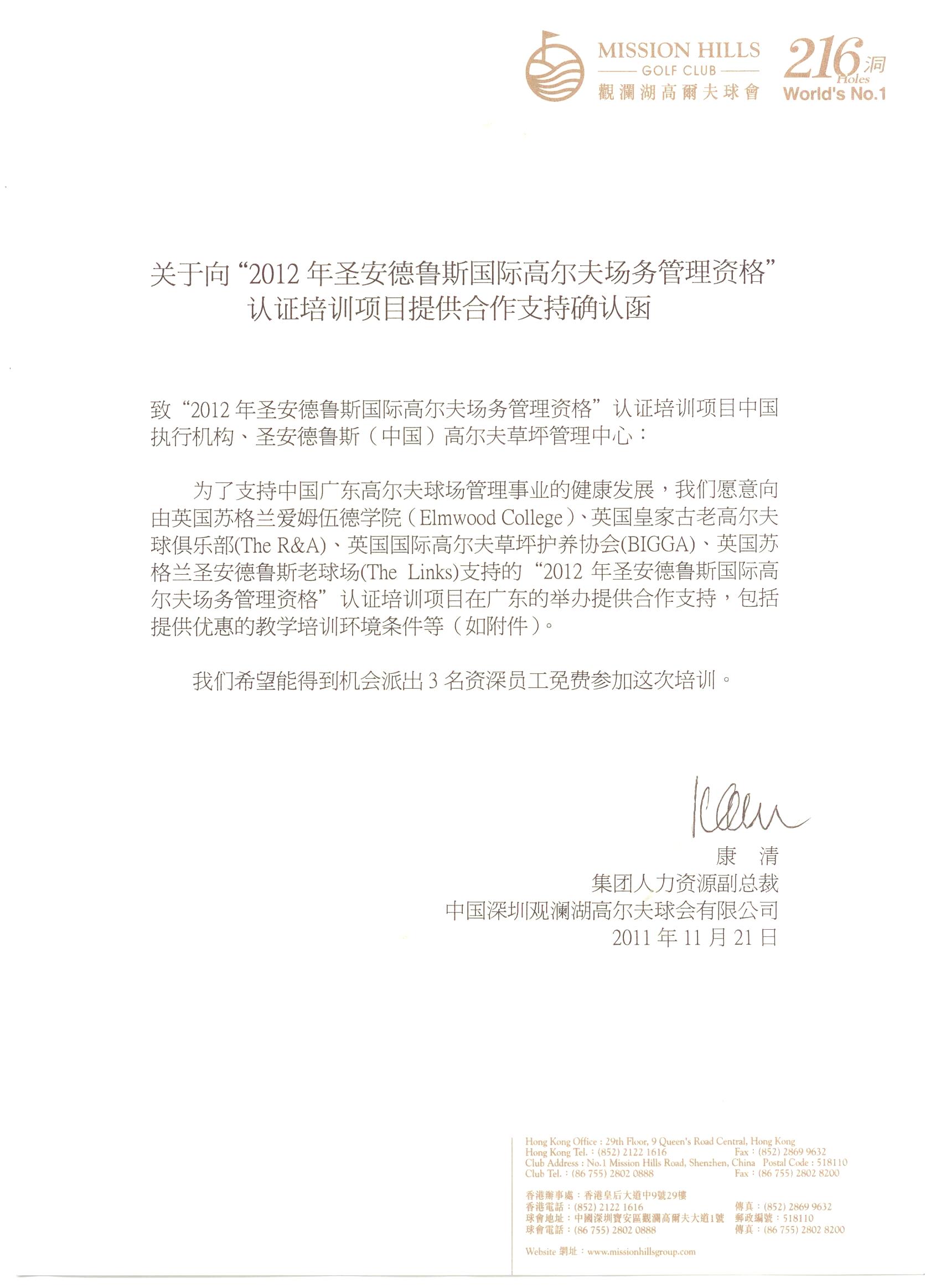 往届圣安德鲁斯国际高尔夫场务管理资格培训支持函