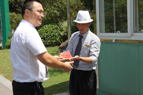 “夏日送清凉”活动是黄山高尔夫“员工关爱”系列活动之一,已持续开展6年。每年夏季最炎热的时候,酒店各部门第一负责人会组成送清凉活动小组,轮番为在烈日与高温下辛勤工作的同仁们送去冰镇绿豆汤、冰镇柳橙汁、冰镇西瓜等各式消暑食品,带去酒店管理层最贴心的慰问与最细心的叮嘱。