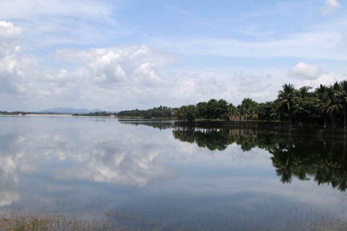 先介绍一下南丽湖景区吧,水面面积1200公顷,是海南省琼北地区最大的人工淡水湖。这里湖水清澈,碧波荡漾,四周胶林环抱,绿树翠竹临岸,山青水秀,明净瑰丽,环境幽静雅逸,气候温和,终年宜泳,宜浴、宜钓。远眺南丽湖,烟波浩渺,水接着天,天连着水,碧波粼粼,湖面上空丽日融融,白云悠悠,徐网习习。水面云影浮游。南丽湖水域,原来是低谷、高山、岩岭。