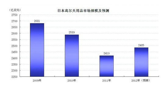 2012年,预估日本高尔夫用品出厂规模为2485亿日元。虽然比地震发生的2011年上涨2.7%,但仍然不会超过2010年,市场短期内仍难恢复。