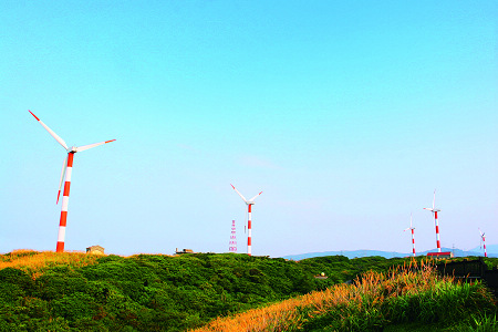 台湾北海高尔夫球场里伫立着巨型发电风车