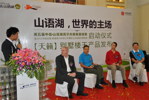 9月8日,中国著名的私家高尔夫别墅大盘【中信·山语湖】举办隆重的第五届中信·山语湖高尔夫精英邀请赛暨2012年欧巡赛香港公开赛职业业余配对选拔启动仪式。为期一个月的高尔夫系列赛正式拉开帷幕,作为欧巡赛香港公开赛的官方合作伙伴,本次比赛将选出2名业主优胜者参加香港公开赛职业业余配对,与世界顶尖职业高尔夫球手同场交流;同时,中信山语湖业主及参赛者将有机会以VIP贵宾身份前往香港粉岭见证这项高尔夫国际赛事。启动仪式上,中信地产广州投资有限公司总经理刘裕兴及广东省高尔夫球协会副秘书长姜勇军、欧巡赛官员接受了记者的专访,介绍了欧巡赛及本届赛事。