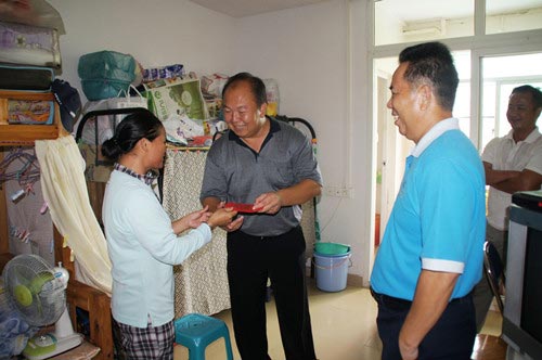 继5月16日翠湖球会全体员工为陈章英同事的妈妈筹款治病行动之后,9月26日,双节来临之际,翠湖高尔夫球会总经理谢家富先生、运营总监萧国华先生等一行领导人亲临走访了家庭有沉重负担的球会员工,为他们送去过节补贴以及米面油等实用物资,并对他们表示了佳节的衷心祝愿。