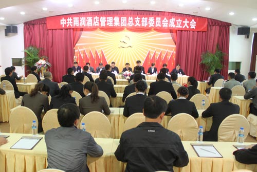 在党旗引领下成长,在自主创新中跨越,喜迎十八大,中共雨润酒店管理集团总支部委员会成立大会于10月24日16:00在黄山高尔夫酒店青松厅隆重举行,黄山市委组织部副部长王振新、屯溪区委组织部部长程绍毅、屯溪区奕棋镇党委副书记谢光辉、雨润控股集团党委副书记兼纪委书记颜迪明、党办副主任张传双、雨润酒店管理集团执行副总裁、雨润酒店管理集团党总支书记赵晓耘等领导出席大会。