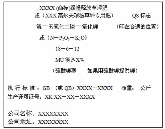 国家相关产品标准规定,产品包装袋必须标示产品名称、规格、含量,由生产许可证的必须标上生产许可证号和质量安全标志(QS标志)、产品执行标准、生产工厂的名称、地址。对肥料要标:氮-五氧化二磷-氧化钾或 N-P2O5 -K2O 的含量是多少。例如含量为18-6-12的硫酸钾型MU缓释肥要标为: