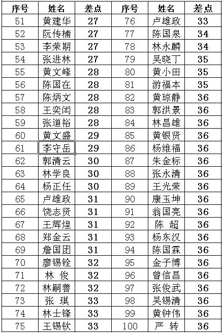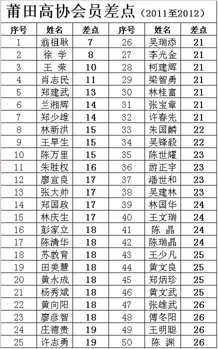 福建莆田高尔夫球协会2012年会员差点排名