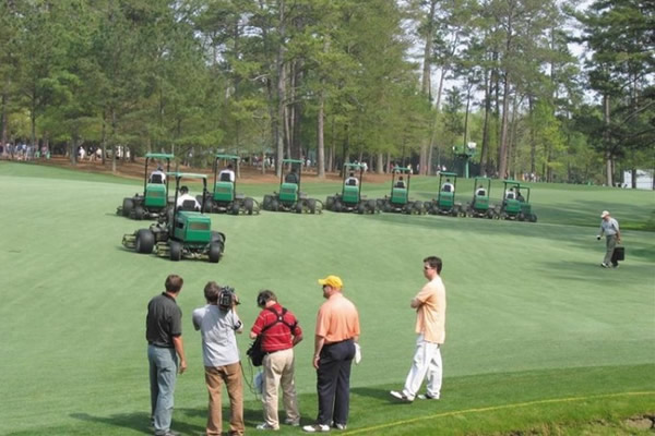 一旦最后一组在18#果岭上推球入洞,球道剪草机开始向着果岭方向进行剪草。看着14台球道剪草机以交错排列的方式前进剪草,是个奇妙的视觉享受。剪草机后面跟着一名机修师,每个操作工都有个网球,既监督自己的操作,也监督自己前面那台机器的操作。一旦发现任何机械故障,网球就会扔向发生故障的操作者前面,并且所有的球道剪草机会围绕周边。剪草机群以势不可挡的方式剪遍球场,这是一周中最值得拍照留念的时刻。