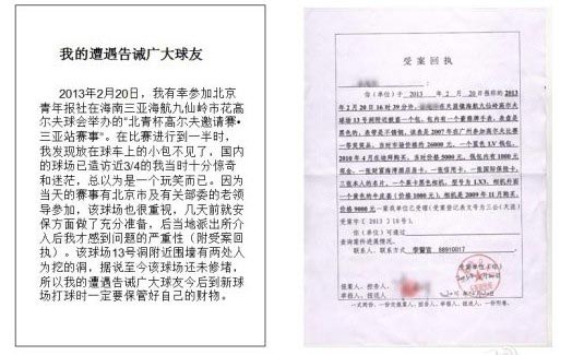 该网友称他是2月份在海南参加一场邀请赛的比赛时遭遇这种事情的,他下场打球进行到一半时,发现放在球车上的手包不见了,还以为是同组选手开的玩笑,后来派出所介入才知道该球场13号洞附近围墙有两个人为挖的洞,通过估计,该球友的损失达五千余元。