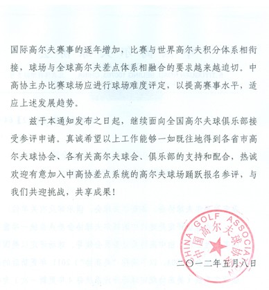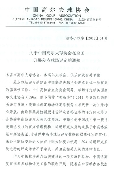 2012年5月,中高协发布了在全国开展差点球场评定的通知, 一年之后,再次发文,仍沿用老文,直接发了扫描件。 文件如下: