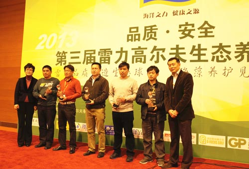 论坛报告后,雷力为在2012年优秀合作伙伴特别颁发了2012年度金牌合作伙伴奖,获奖球场代表纷纷高兴的上台。汤洁总经理、赵美琪教授、范越秘书长、曹亚东总经理为获奖的十家球场颁发了水晶奖杯。据知,除了代表荣誉的奖杯,雷力还将赠送获奖球场价值3000元的雷力最新产品--海藻肥艾格300。
