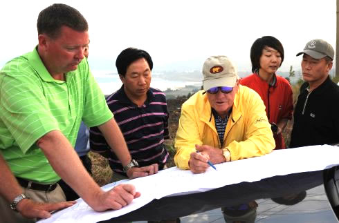 整整三个半小时,杰克·尼克劳斯和尼克劳斯二世以及助手们都在项目现场用地踏勘并讨论着,从湖景到山景,从球道走向的合理性到周边环境的改造和利用,从土石方的计算到最大限度地利用自然的山形地貌设计球道,从草种选择、园林景观到喷灌、水景的设计,从球场、会所、酒店、别墅的关系以及资源合理配置的利益最大化……年近七旬的杰克不知疲倦地在山地转悠着、讨论着,并时不时在设计草图上做一些标志和修改,雨过天晴的山地里不时有些泥泞,山路也时不时有些陡峭,但他全然不顾,全身心地投入到设计和工作上,其敬业精神和工作态度令在场的人都深为赞叹和感慨。我们也由衷地相信,有这样一位设计大师全情投入的参与,云南华侨城高尔夫项目一定能跻身于国际一流、中国顶级的高尔夫球场行列。