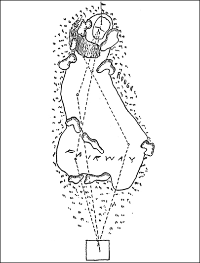 4. 20世纪30年代初,年纪尚轻的罗伯特-特伦特-琼斯(Robert Trent Jones)重新设计纽约州伊萨卡乡村俱乐部时,设计了这样一个三策略五杆洞。球场的原设计者-迪灵哈斯特。