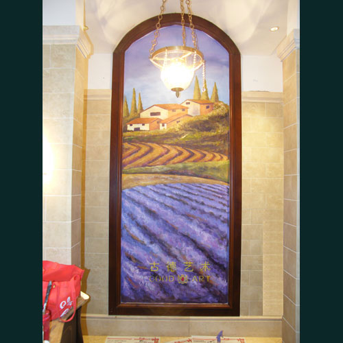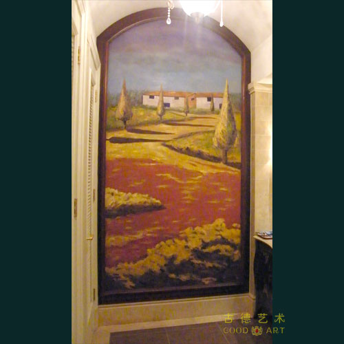 蓝光•观岭的高尔夫球会所,是富人们休闲娱乐的好去处,根据这里主体人群的特点,在壁画的配置方面则需要营造一种金碧辉煌而又不失高雅。所以我们配置这些壁画的的时候,大多选用红黄色调的壁画为主。整个画面的则采用塞尚的画法,这样色彩看上去既鲜艳而又沉着。