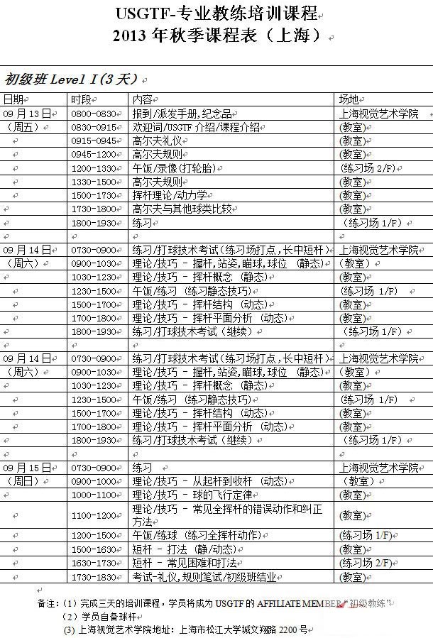 3) 能力测试:男性学员:两轮(36洞)低于166杆(高级班-认证教练)
