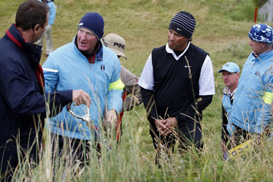 在第一天的比赛中,来自英格兰的选手Anthony Wall在第11洞把球打到了球道左侧的树林中。虽然他幸运地找到了自己的球,但是却发现球有一半陷入了树坑里松软的草堆之中。显然,这是一个非常难打的球位。在比赛的当地规则中规定,这些区域都属于球场的不可分割部分。换句话说,球停在这里后,球员要么在现有状态下打球;要么宣布球不可打,被罚一杆后进行处置。但此兄通过对讲机把我叫了过来(当时这个球洞属我的负责区域),指着那堆草跟我说:“这堆草本来不应该在这里的,它应该是整修地,我应该有无处罚的抛球机会。”