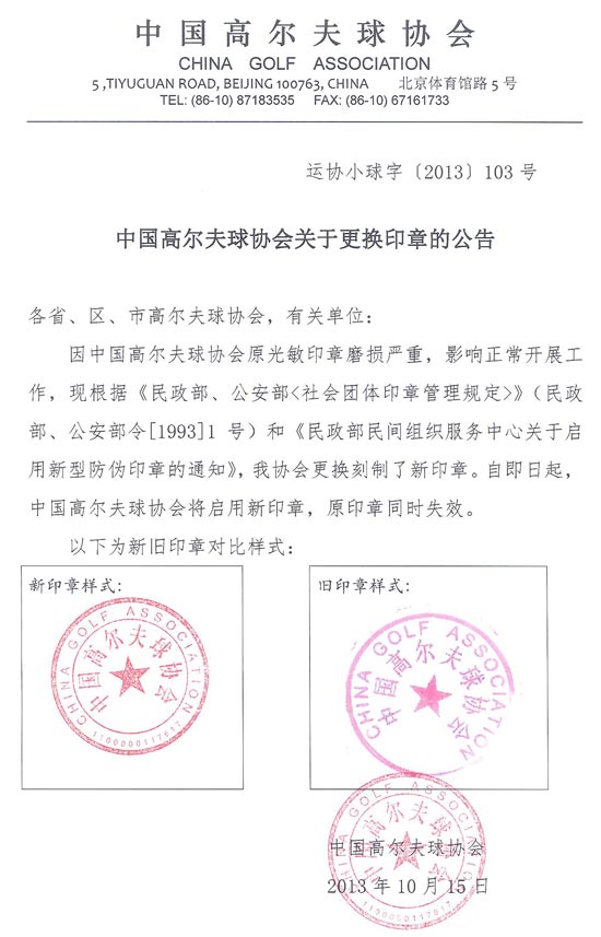 中国高尔夫球协会关于更换印章的公告