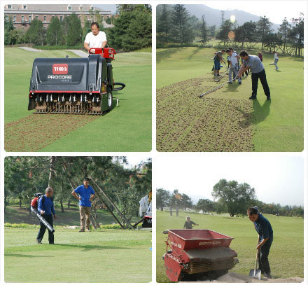 过去北方农家会在收获后往地窖里存积粮食和蔬菜以应对没有新鲜蔬菜的漫长冬季,同样,秦岭国际高尔夫会对草坪进行打孔,铺沙等作业以应对即将来临的冬天。时间一般在九月中旬,国庆节之前两周。这种作业的主要目的在于防止由于夏天客流量过大和草本身生长旺盛对果岭造成的压实。也会相应除去厚厚的枯草层,使小草根部土壤的空气流通,有助于根系储存更多的能量抵御冬日的严寒。