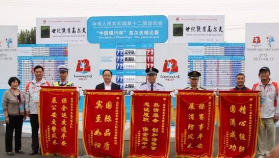 第十二届全运会高尔夫球团体赛在沈阳世纪熊鹰高尔夫俱乐部圆满结束。赛事组委会对赛事期间交通安保的热情服务和交警的辛勤付出给予了高度的评价赞扬!并授予了印有“保全运交通平安,展公安交警风采”的锦旗!