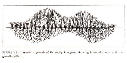 第二张图显示的是草地早熟禾的生长周期。作为多年生草种,草地早熟禾不同于一年生早熟禾,地上部分的生长旺盛期集中于初夏和早秋,根系生长只有两次高峰,分别于春季和晚秋。对比前两张图可以推论出,如果要控制草地早熟禾球道上的一年生早熟禾,最好的时机就是4-5月一年生早熟禾集中开花的时候,这个时候正是草地早熟禾旺盛生长的时候,良好的肥力管理,足量的灌溉都可以帮助草地早熟禾“战胜”一年生早熟禾。因为一年生早熟禾这个时期根系的限制,施用的肥料可以保证大部分被草地早熟禾吸收。反之,如果在初夏一年生早熟禾根系迅速生长,草地早熟禾生长减慢的时候大量施肥,只会促进了一年生早熟禾,造成肥料的浪费。