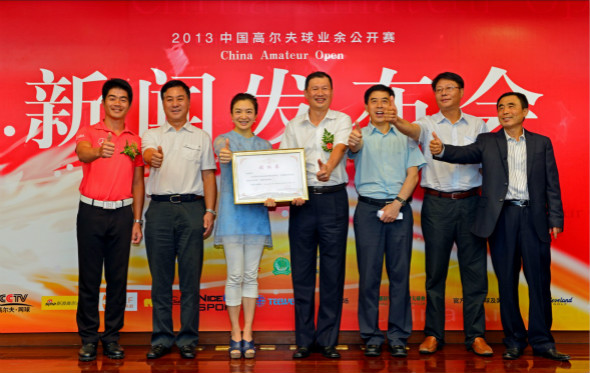 在2013年赛事新闻发布会上,中国著名选手梁文冲、国家体育总局小球运动管理中心主任张小宁、体坛传媒集团股份有限公司副总裁兼大师高尔夫发展有限公司总裁陈菁、广东高协秘书长姜勇军、广东体育局副局长兼广东高协常务副主席王禹平、体坛传媒集团董事长张敦南、高网频道总监单明共同见证中国业余公开赛开启新时代。