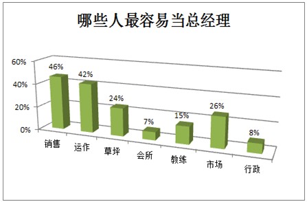 这是个很有趣的问题。如果上面的统计有效的话,我想那些不在这个“最有机会”的范围内的员工位、中层管理者们,是不是会老虎转转部门之类的。在收到的100多份有效的调查当中,经理们有46%管过销售、有42%管过运作和26%出身于市场。由此看出,大多数球会目前最依赖懂市场、有销售能力、熟悉高球运作的管理者。