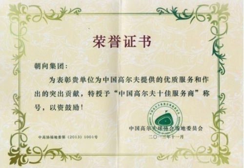 在评优表彰中,朝向获得了“中国高尔夫十佳服务商” 的殊荣,位列榜首。组委会对朝向为中国高尔夫建造行业作出的贡献给予了高度评价。2013年,由朝向及美国景观无限公司联合建造和管理的中信山钦湾高尔夫俱乐部进入了美国《高尔夫》杂志 “世界百佳”球场榜单,是中国首家世界百佳球场,对中国高尔夫行业具有里程碑的意义,使中国的高尔夫在世界的影响越来越大。