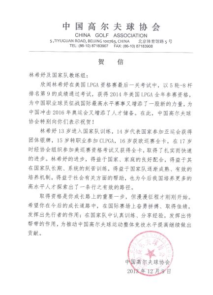 中国高尔夫球协会祝贺林希妤及国家队教练组
