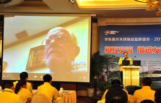 会议开始由来自景观无限的杰夫-马萨雷利针对高尔夫球场建设为题作了报告,杰夫-马萨雷利先生在报告中对球场基本要素、一个球洞的构造、高尔夫专业术语、建设阶段、施工阶段等细节进行了详细的阐述。