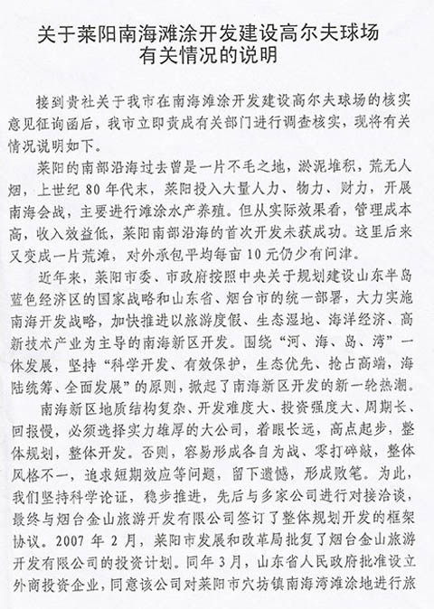 关于山东莱阳南海滩涂建设高尔夫球场说明
