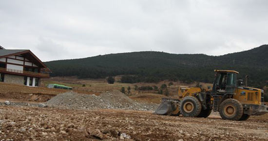 球场的另一端,不乏有挖掘机、铲车等机械设备在扩展球场施工场景。被毁损的树木还没有被运走,开挖推平的山地上,被覆盖一层黄土,还没有种植草皮。空旷的球场与周围覆盖树木山林比较,原本的青山绿地已是“遍体鳞伤”。