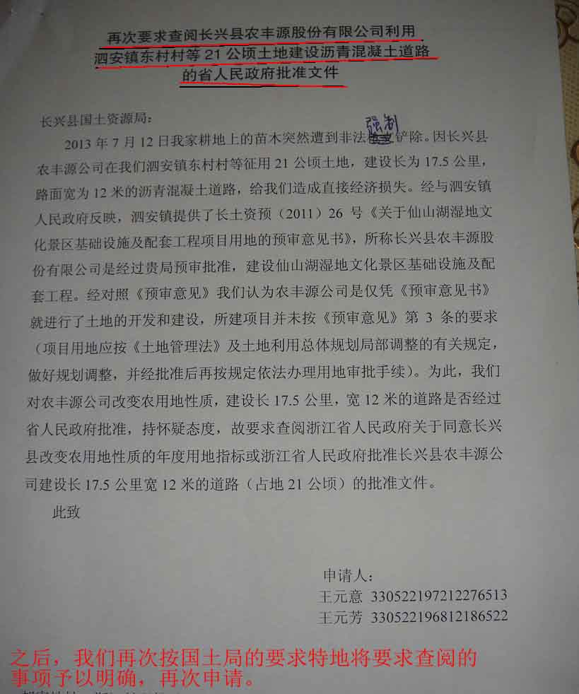 征地并未经当地村民同意,也拿不出省一级的用地批文。此前我们曾向县国土局要求查询该项目的信息公开申请,可长兴县国土局两次答非所问,忽悠我们,就是不肯出示该项目的批准文件。