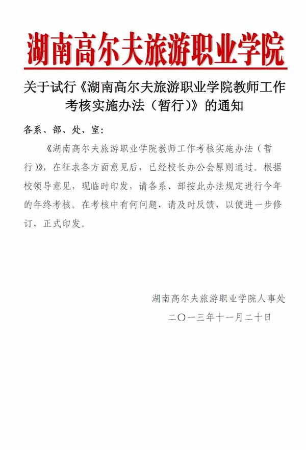 关于试行《湖南高尔夫旅游职业学院教师工作考核实施办法(暂行)》的通知