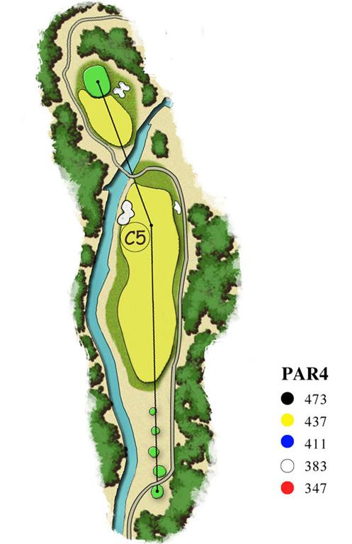 C5(标准杆四杆):全场最长的一个四杆洞、全场最难的一个四杆洞。开球几乎没人敢用一号木杆。要想把球放到最佳攻果岭的位置,技术和运气各占一半。想要尝试保守打法,那只能把它当作五杆洞来打了。攻果岭需要克服巨大的心理压力,一路上坡,陡峭的沙坑守护着狭长的龟背果岭,让人心惊胆战、望而生畏。