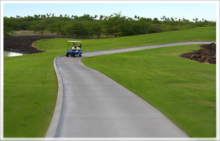 一般高尔夫球场的球车道长度为30000英尺(约9144m),如果使用混凝土建造,费用将超过40万美金(美国2000年标准),如果用沥青,则在30万美金左右。