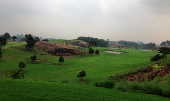 再说建造。据介绍,新球场的改造,是由Som boon高尔夫工程公司桑潘先生亲自督建的。桑潘我认识,这是一个非常敬业且经验丰富的球场建造师和造型师,来自泰国,在中国高尔夫建造领域已经摸爬滚打了20余年,当年曾参与了深圳观澜湖和华侨城云海谷球场的建设。我感觉,球场的建造完全体现了设计师的意图,丹霞岩石景观始终处于视角的重心,但沙坑的设计和处理,球道的造型和起伏变化却也处处透出匠心,这是建造者的投入和用心。