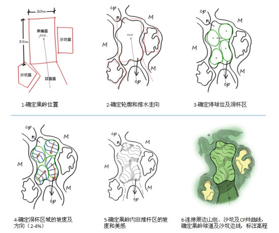 第二,为了增加推杆技术,丰富球的行走路线和速度变化,增添球手的趣味性。在洞杯区相邻的过渡区域,坡度可在5%—20%变化。