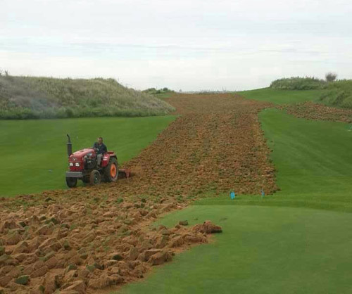 据介绍,鄂尔多斯这家球场是在沙漠中建立起来的绿洲,为林克斯风格的球场,植草已经完成。从图片中可以看到,球道草坪使用的是本特草,沙坑中的沙子已经铺设完毕,远处的会所似乎也已经可以使用。但是这样即将开业的球场,却被铲掉。一辆犁田车将球道翻了个遍,本特草的草坪来不及保护起来,只要太阳一晒草坪将枯萎,令人痛心。